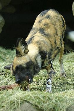 Le lycaon est de la famille des canidés, c'est donc une sorte de chien sauvage. Il pèse de 20 à 30 kg et mesure de60 à 80 cm au garrot pour 1.5m de long. Son espérance de vie est de 11 ans. Il vit en meutes de 5 à plus de 40 individus dominés par un couple. Cet animal est très particulier en raison de son comportement social: les vieux individus ne pouvant plus chaasser ne sont pas abandonnés mais sont nourris par régurgitation des aliments. Pour chasser,les lycaons peuvent courir à 65 km/h pendant une heure, tuant leur proie de fatigue.